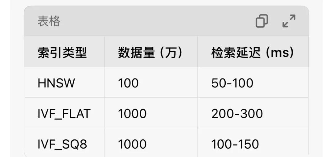 • 索引选型:中小规模数据(100万向量内)用HNSW索引(M=16,efConstruction=200),兼顾速度与精度;超大规模数据(千万级向量)用IVF_FLAT索引(nlist=1024),配合量化(如SQ8)减少内存占用。