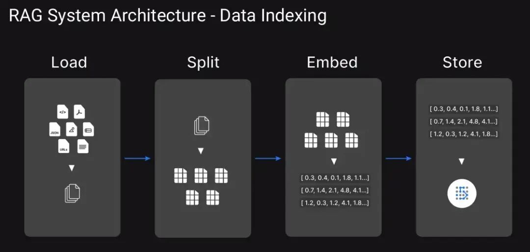 这个 RAG 系统架构展示了向量存储中块嵌入的基本存储方式。第一步是加载文档,然后使用各种分块技术对其进行拆分或分块,最后使用嵌入模型进行嵌入,以便 LLM 能够轻松理解。