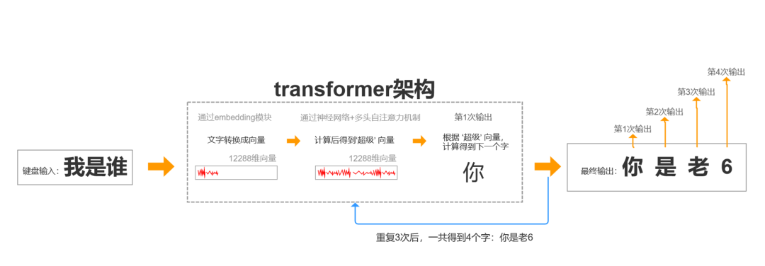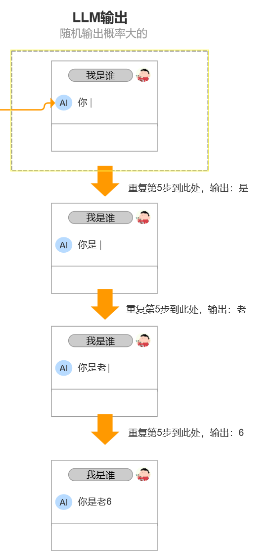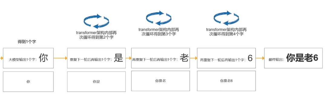 最终的输出如下所示,我们输出第一个字之后,这个字又会成为我们第一次输入的内容其它的新的内容一并输入给大模型。也就是每次新输出的内容都会当做下一轮除原始输入内容其它的输入内容来作为大模型的输入资料。