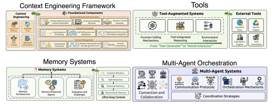 - • 记忆系统(Memory Systems):从长期存储中召回的信息,例如跨会话的用户偏好、个人资料或历史交互记录。