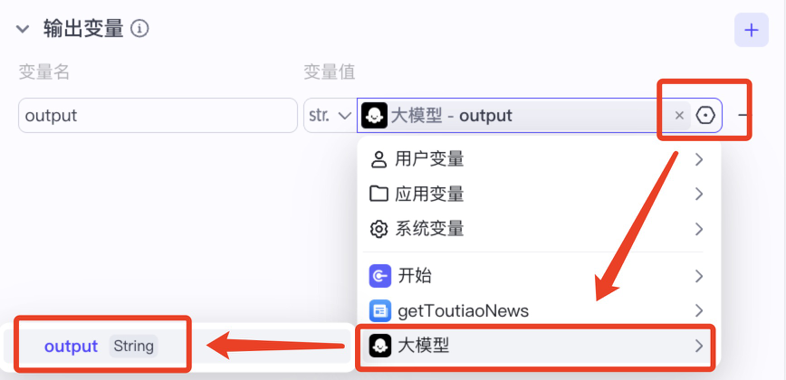 来到我们最后一个节点的设置,跟在上文我们的测试环节中所设置的那样简单,这次只需要将输出的变量更换为来自“大模型”节点的处理结果即可,即“output”: