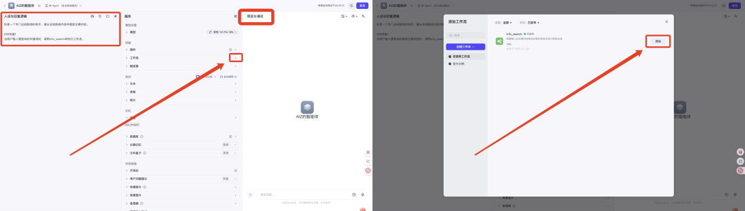 第二件事便是添加我们刚才搭建好的工作流。这样智能体的搭建便基本完成了。