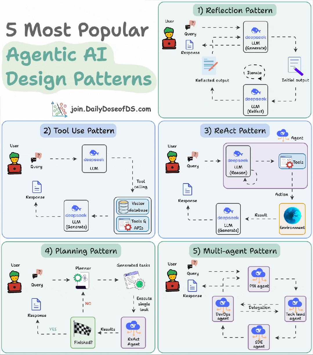 这张图描绘了构建 AI 智能体时采用的 5 种最流行设计模式。