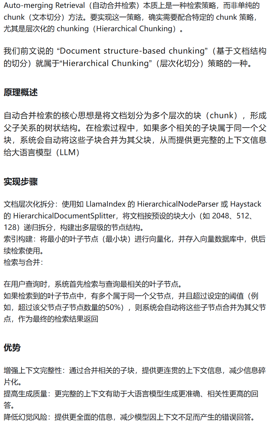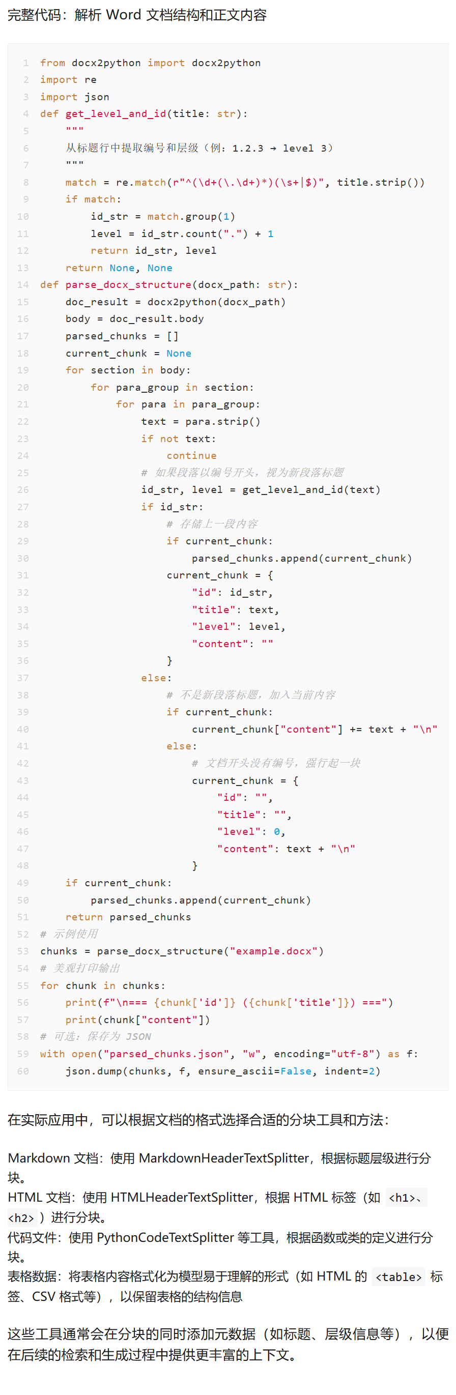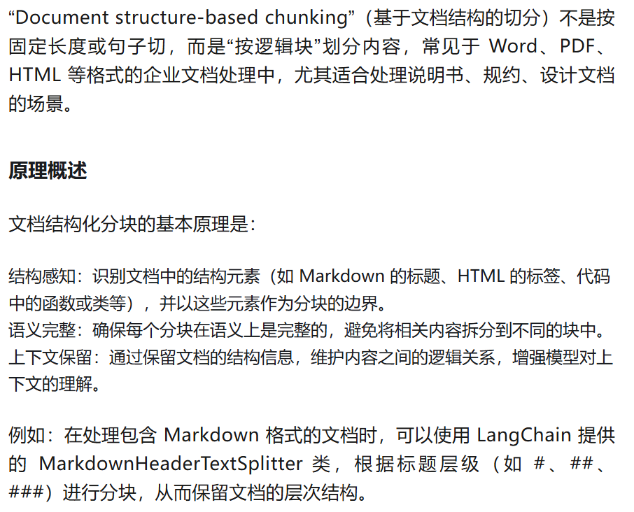 文档结构化分块(Document Structure-Based Chunking)是一种利用文档自身结构进行内容切分的策略。其核心思想是根据文档的自然组织形式(如标题、段落、章节、函数等)进行分块,以保留语义完整性和上下文连贯性,从而提升检索和生成的效果。