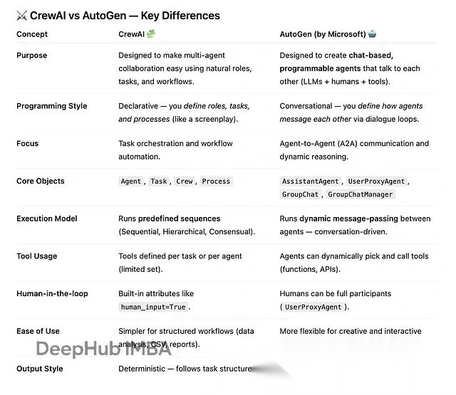 相比于CrewAI,AutoGen 则把重点放在讨论、推理和演化上,而CrewAI 更关注执行层面。