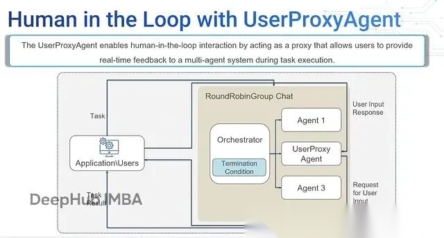 - UserProxy Agent:充当人机接口层,转发消息和响应