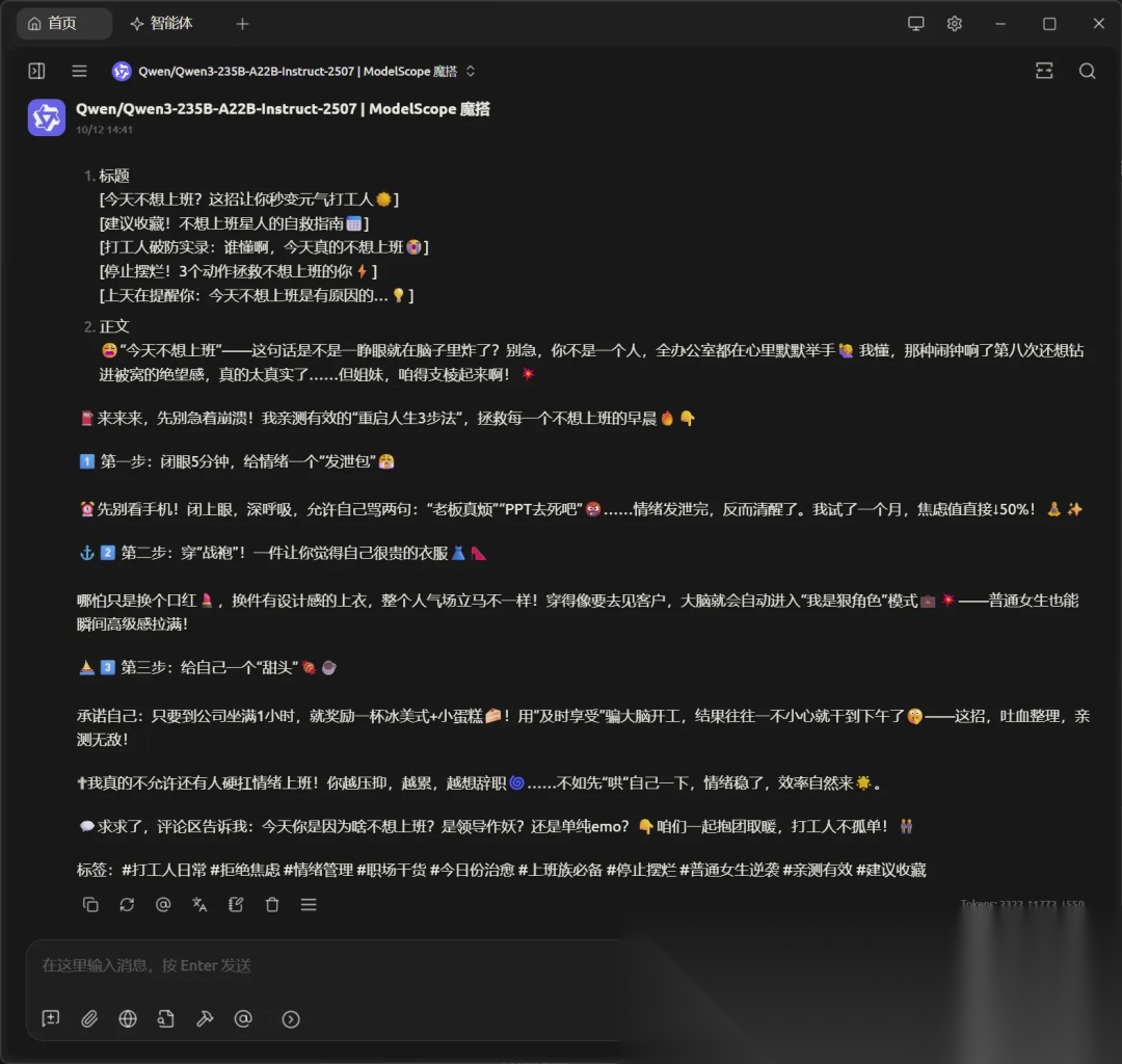 我们用Qwen3-235B-A22B-Instruct-2507这对比测试一下,一个使用本系统提示词一个不定义。提示词里要求要输出5个标题备选,所以输出里会有个多个标题备选。而且将标题、正文、标签在不同区域输出。除了标题部分之外,正文和标签部分表现差异也比较大。