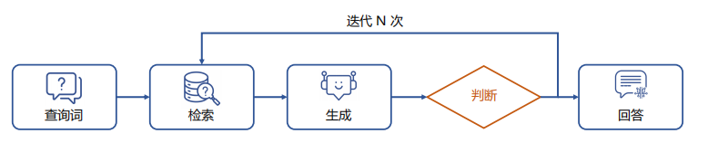 迭代型循环模式通过多次执行检索和生成操作,在每次迭代中逐步优化结果。如下图所示,在每一步迭代中,系统根据当前的查询和之前的输出结果来检索相关文档,然后使用这些文档生成新的输出。迭代过程通常会设置一个 最大迭代次数的限制,以避免出现无限循环。在每次迭代后,判断模块会根据当前的生成结果、历史输出、查询和检索到的文档来决定是否继续迭代。迭代型模式非常适合那些需要逐步收集信息并动态调整的任务,能够逐渐完善对复杂问题的回答。