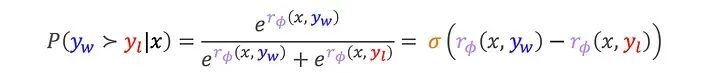 奖励模型r_φ的训练通常采用Bradley-Terry模型将未观察到的隐式分数与偏好联系起来: