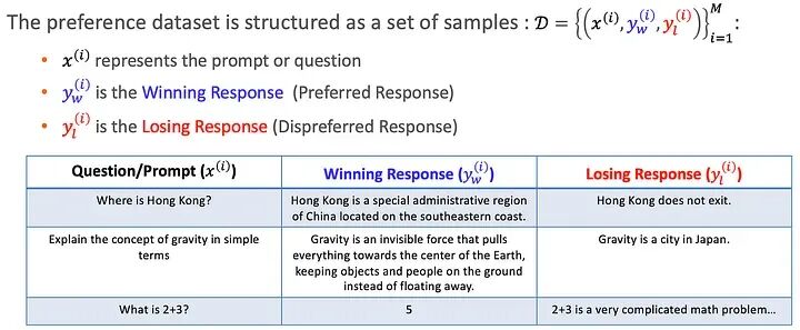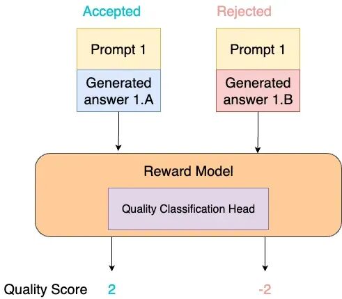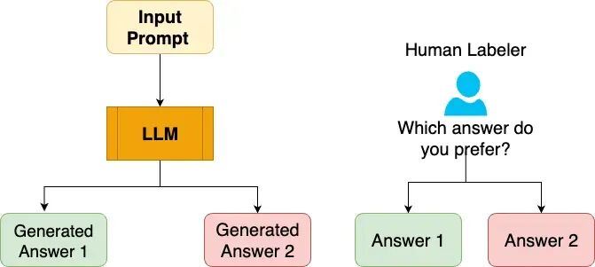 在RLHF中,偏好数据集用于训练奖励模型来为潜在答案评分,本质上是学习预测人类偏好。这种方法使模型能够整合人类对不同问题类型和领域答案质量的判断。