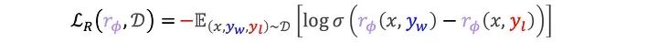 其中σ()是sigmoid函数。基于这个表达式,我们可以定义训练奖励模型的损失函数L_R(r_φ, D)。负号是因为我们想要最小化损失。