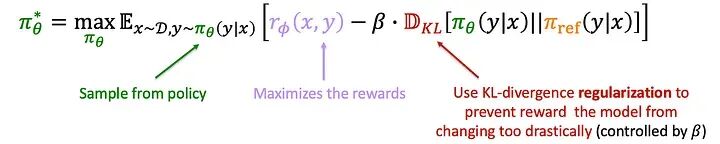 这个公式旨在最大化预期奖励,同时保持优化后的策略π_θ接近参考策略π_ref,从而防止奖励黑客攻击。这体现了RLHF的核心思想:既要让模型学习产生高质量的响应,又要保持与原始模型在分布上的相对接近性。这种平衡确保了模型在获得更好对齐能力的同时,不会失去其基本语言生成能力。