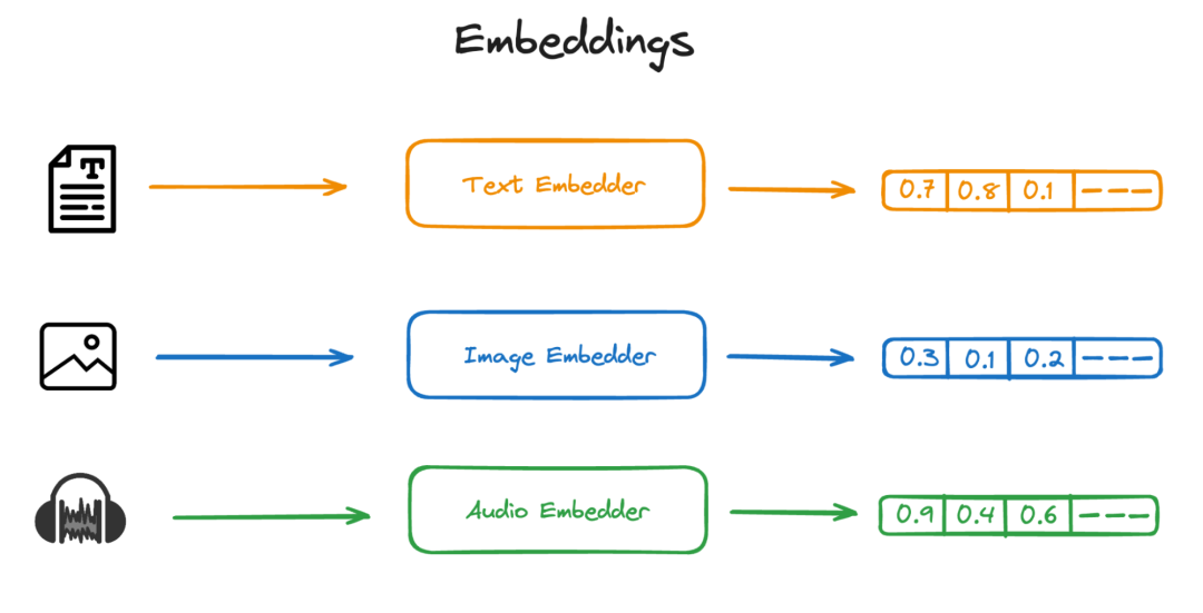 - 数据向量化:外部知识(文本、文档、图像等)会经过“向量化”过程从其原始格式转换为向量表示(embeddings)。那么执行这个“向量化”过程的就是一个嵌入模型(Embedding Model);