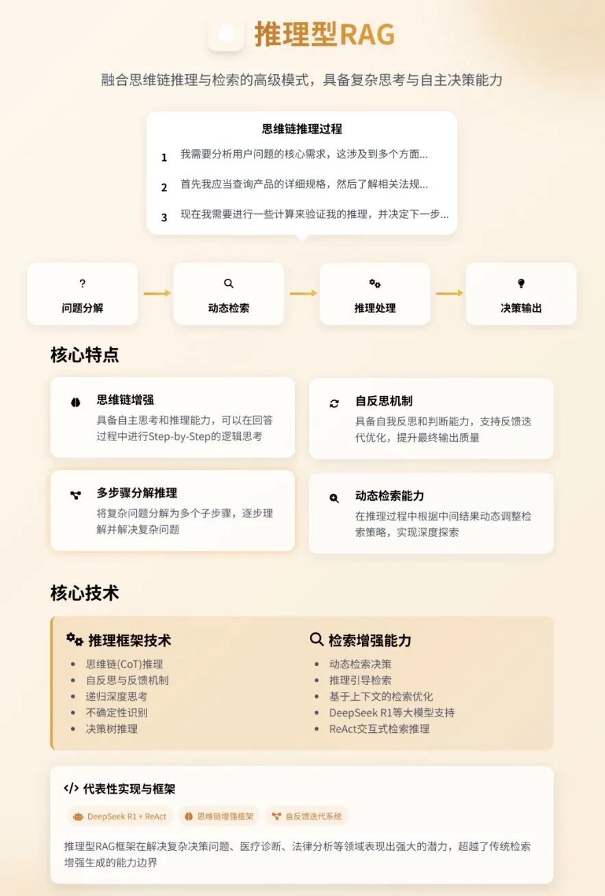 技术实现细节: 推理型RAG的实现依赖于精心设计的提示工程和推理框架。系统通过结构化的推理模板引导大语言模型进行逐步推理,同时利用中间结果指导后续的检索过程。