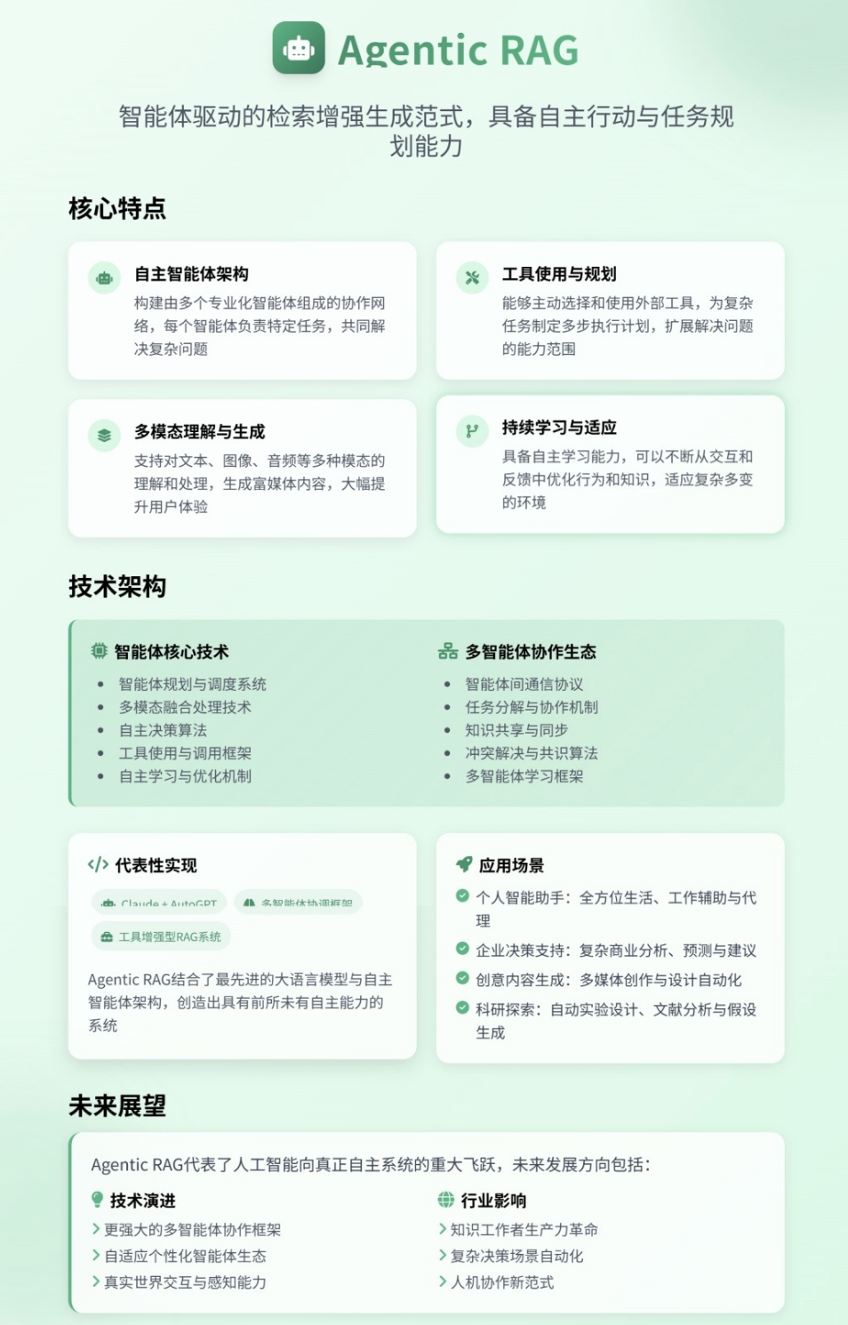 Agentic RAG的出现标志着RAG技术从工具转向智能伙伴的重要转变,它不仅能够回答问题,更能够主动思考、规划和执行复杂任务,为构建下一代AI助手奠定了坚实的技术基础。
