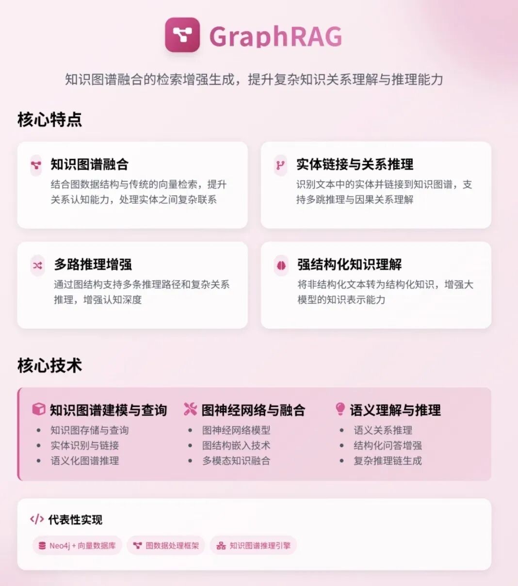 GraphRAG代表了RAG技术向结构化知识表示的重要转变。与传统的文档级检索不同,GraphRAG构建了细粒度的知识图谱,实现了实体级别的关系推理。