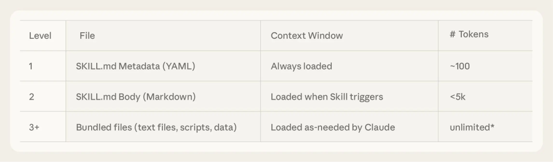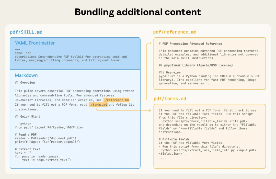 SKILL.md文件的目录。SKILL.md必须以 YAML Frontmatter 开头,包含名称和描述等元数据。这些元数据会在 Agent 启动时预加载到系统 Prompt 中,提供第一层级的渐进式披露。如果 Agent 认为该 Skill 与当前任务相关,它会加载完整的SKILL.md到上下文中,这是第二层披露。对于更复杂的 Skill,可以捆绑额外的文件(如reference.md或forms.md),Agent 可以根据需要进一步导航和发现这些文件,实现更深层次的渐进式信息披露 [5]。