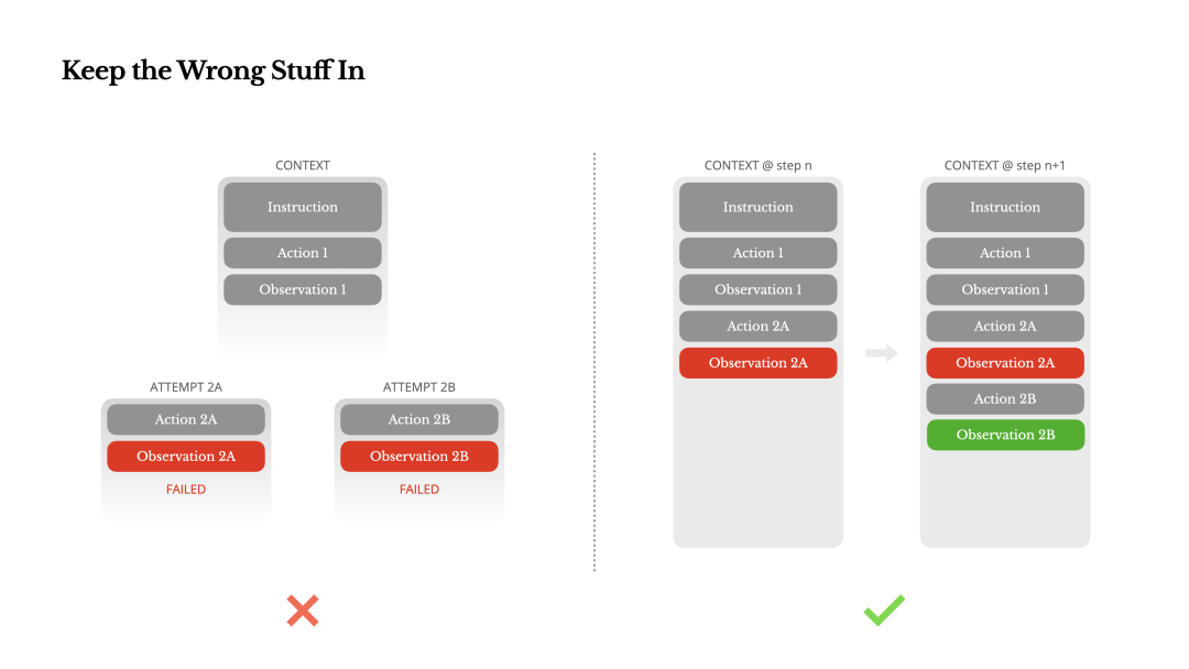 根据经验,改进智能体行为的一个极为有效的方法,实则相当简单:把错误的步骤保留在上下文当中。当模型看到某个动作失败,以及随之产生的观察结果或堆栈跟踪信息时,会不自觉地更新其内部认知。这会使模型在后续决策中,减少选择类似动作的可能性,从而降低重复犯错的概率。实际上,错误恢复能力是衡量智能体是否具备真正智能行为的重要指标之一。