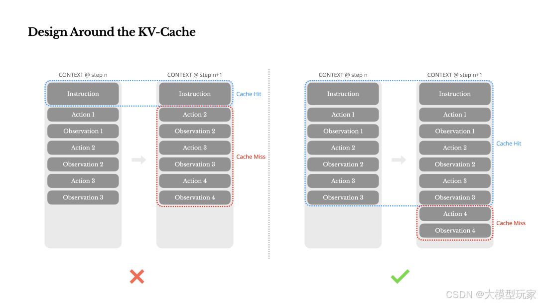- • 上下文追加模式:避免修改历史动作或观察结果,确保序列化过程的确定性,以维持缓存的有效性 [1]。