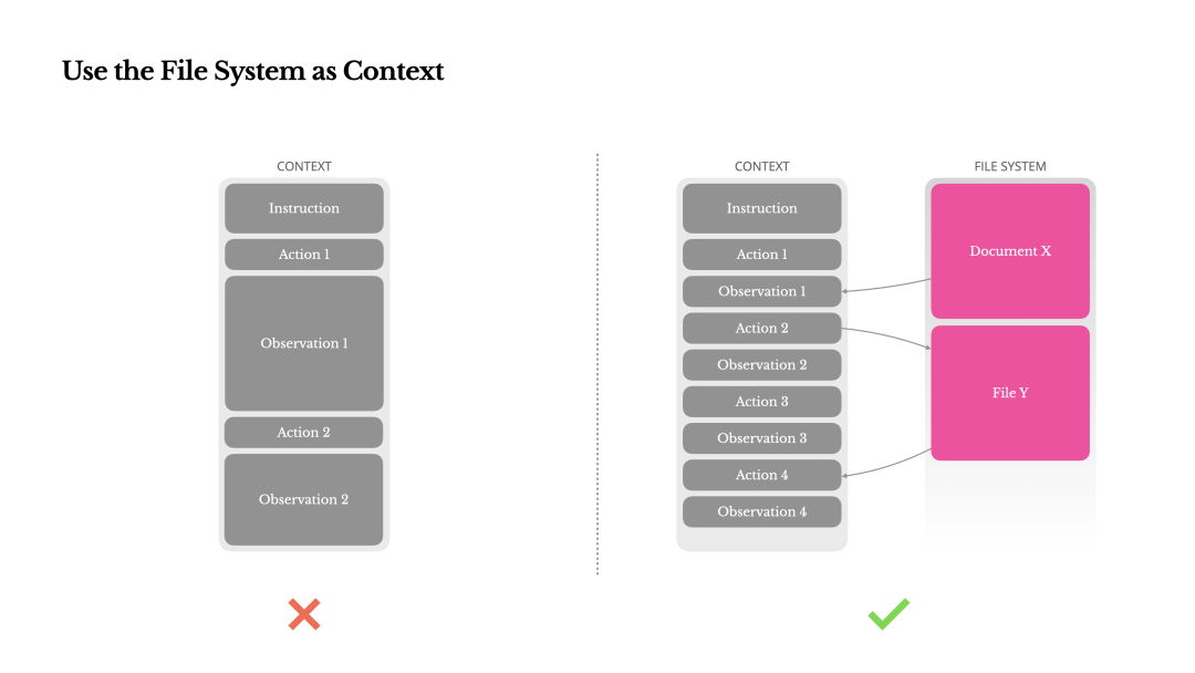 - • 文件系统作为外部化记忆:将文件系统视为无限大小、持久化的外部记忆,允许模型按需读写文件,将其作为结构化的外部化记忆使用 [1]。