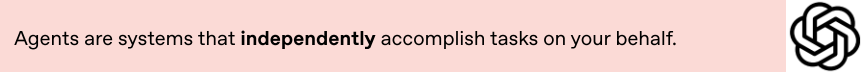 传统 LLM 只能进行对话聊天,而无法像人一样帮你完成某些操作,例如你可以和豆包对话,问它 “帮我抢一个从北京到西安最优惠的机票。” 那么它只能给你一个如何去找最优惠机票的方法,而无法实现帮你去抢机票,例如操作手机或电脑来帮你抢机票,而对于 Agent 而言,它不仅可以帮你规划如何去找最优惠的机票,并且可以帮你实际去抢 ,用 OpenAI 的定义来说,也就是独立帮你完成了抢最优惠机票的任务。