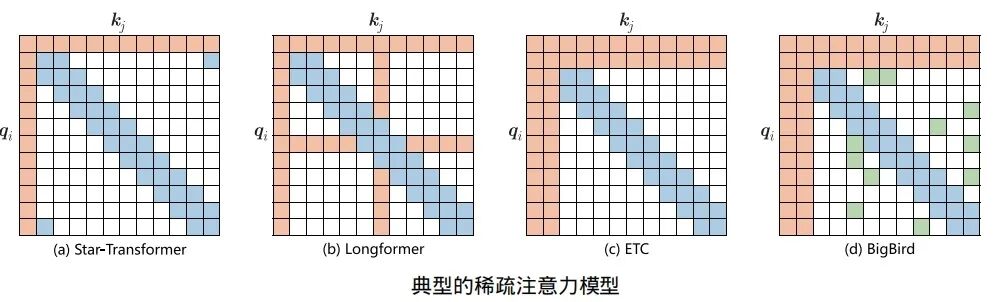 - BigBird:采用带状注意力、全局注意力和随机注意力的混合方式来近似全连接注意力。研究表明,稀疏编码器和解码器的组合能够模拟任意图灵机,这也从理论上解释了稀疏注意力模型取得良好性能的原因。