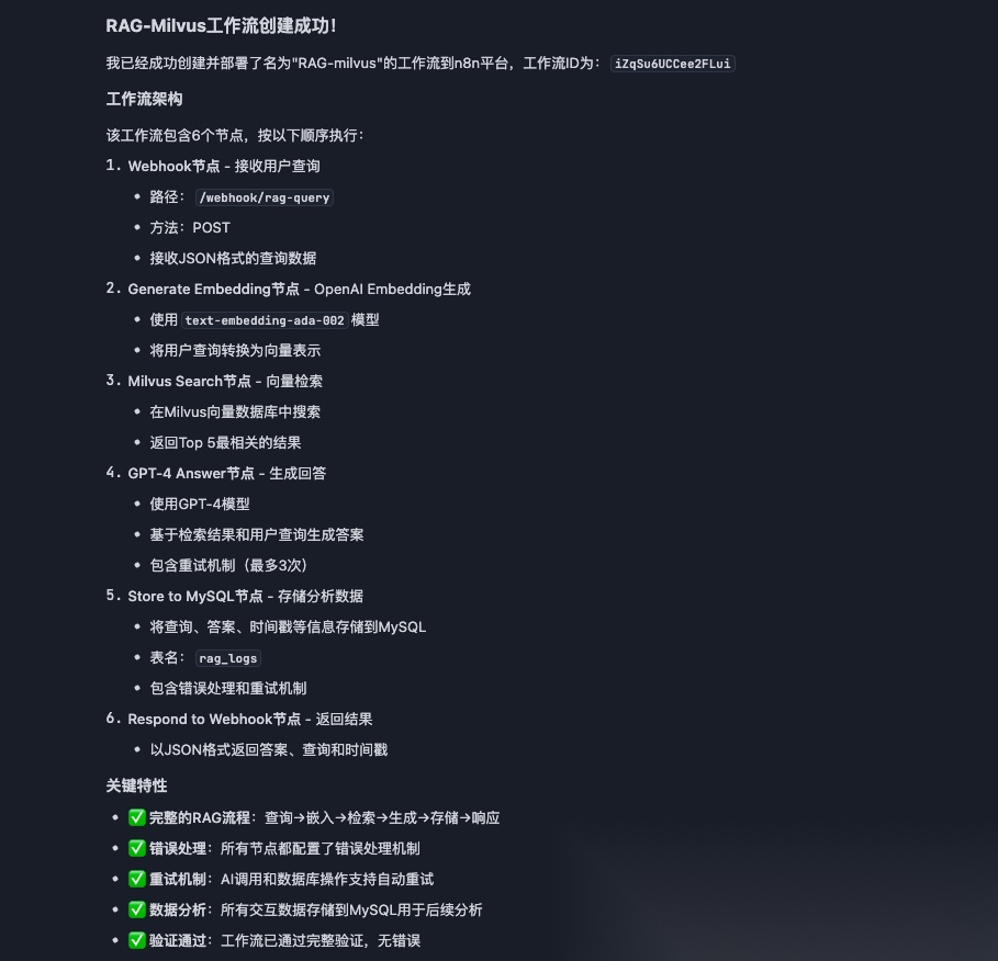 请创建一个名字为RAG-milvus的工作流,并直接部署在n8n平台,要求: