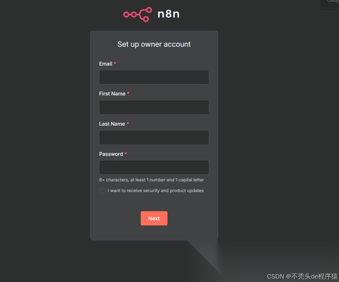 说明首次访问n8n时,请根据提示完成账户信息的初始化设置。