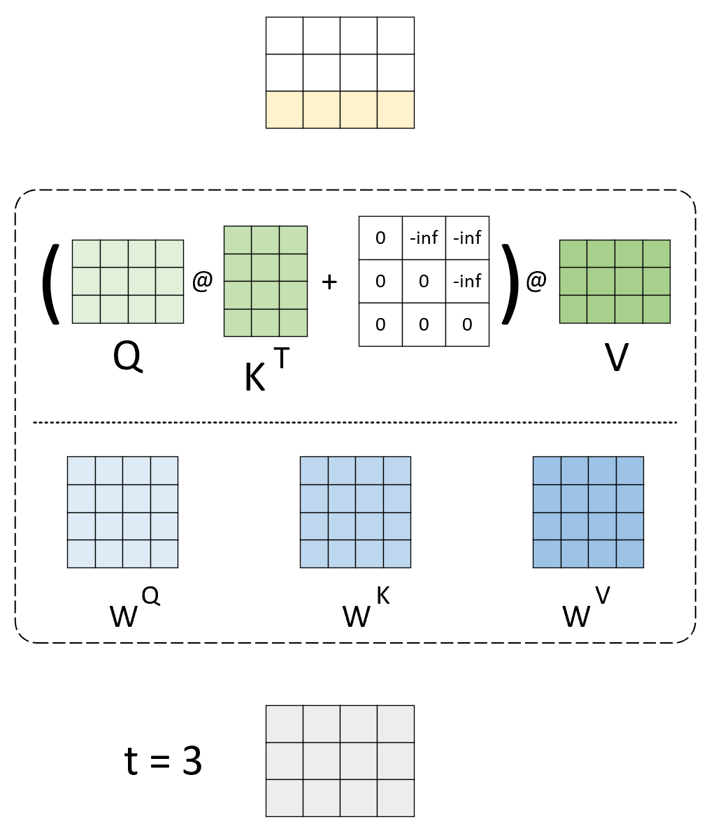 进一步,得到 、 和 后将完成自注意力计算过程并得到最后的输出。这里需要注意的是,因为此时已经是逐时刻进行解码,模型可以看到当前时刻之前的所有信息,所以不再需要进行 attention mask 操作。同时,我们已经可以知道,对于 的输出结果,依旧只会取最后一个时刻对应的结果作为 时刻生成的内容,其余时刻的结果无用。