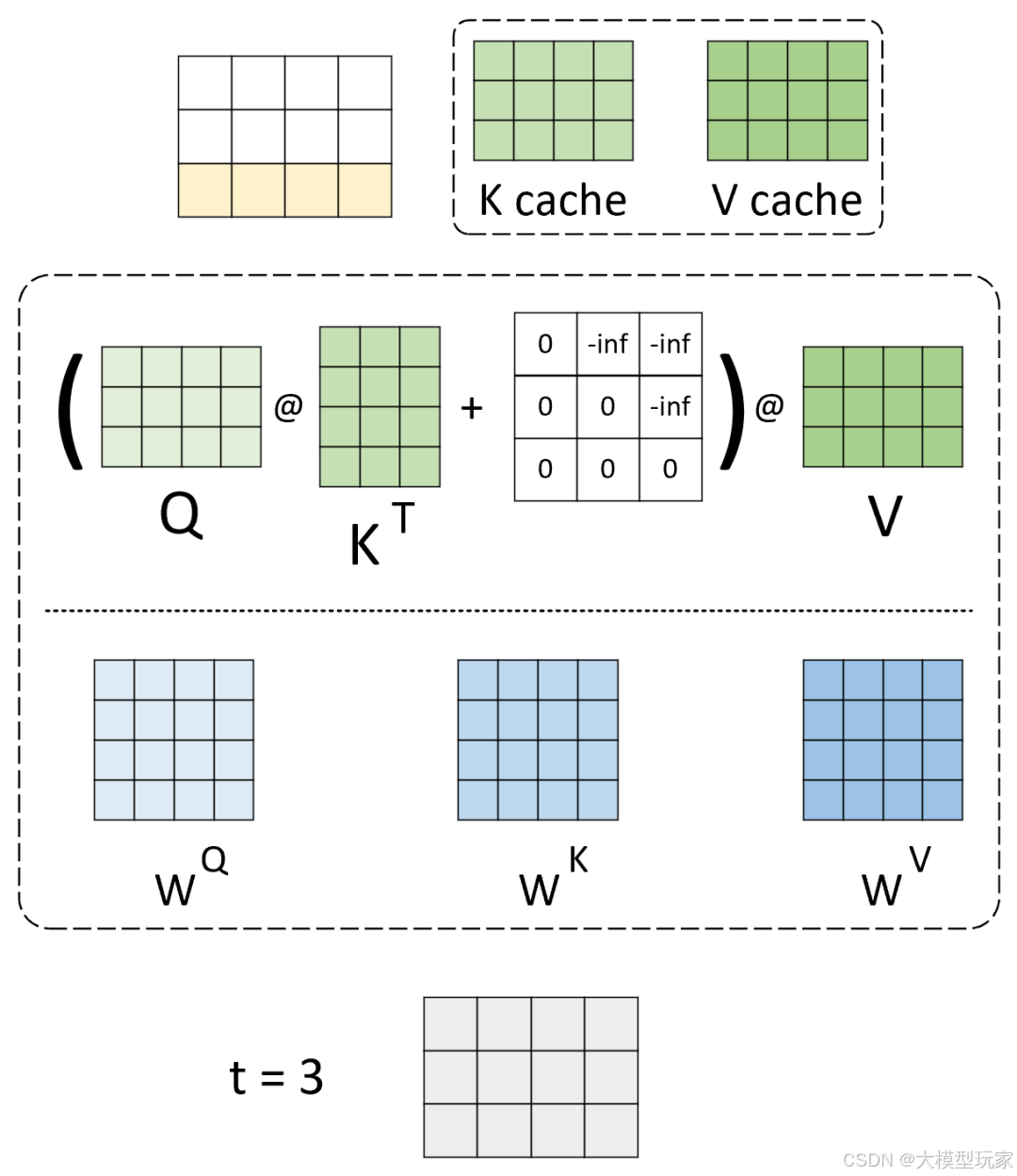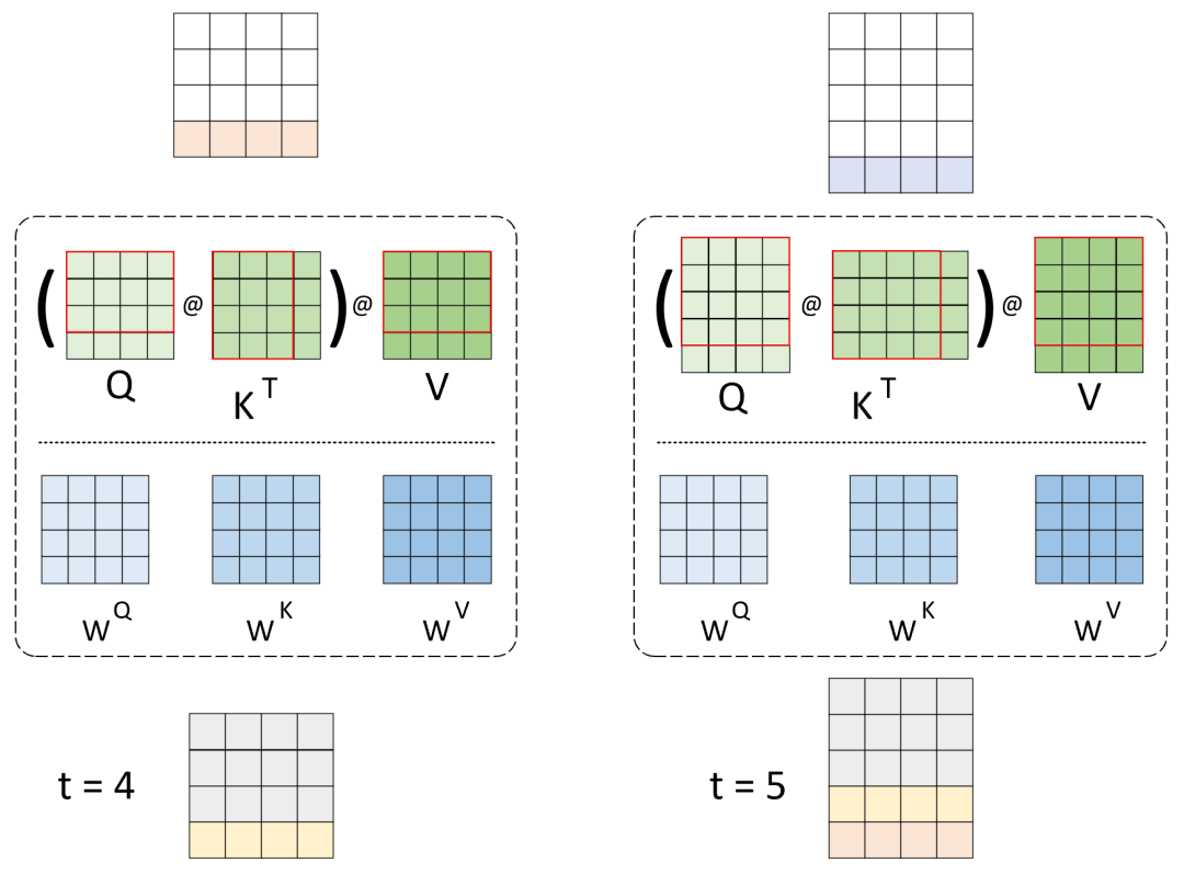 在图4中,模型对第 时刻解码时,会将整个 prompt 以及到当前时刻为止已经生成的内容拼接起来作为输入来生成当前时刻的结果。同理,此时的输入首先将完成 3 个线性变换分别计算得到 、 和 ,然后进行后续计算。此时我们可以发现,在第 时刻时,其输入序列的前 3 个 token (图中灰色部分)在第 时刻中已经分别进行过了一次同 、 和 的线性变换,也就是说此时 、 和 这3个矩阵的前三行都是之前已经计算过的(图中红框中的内容),这里是在重复计算。
