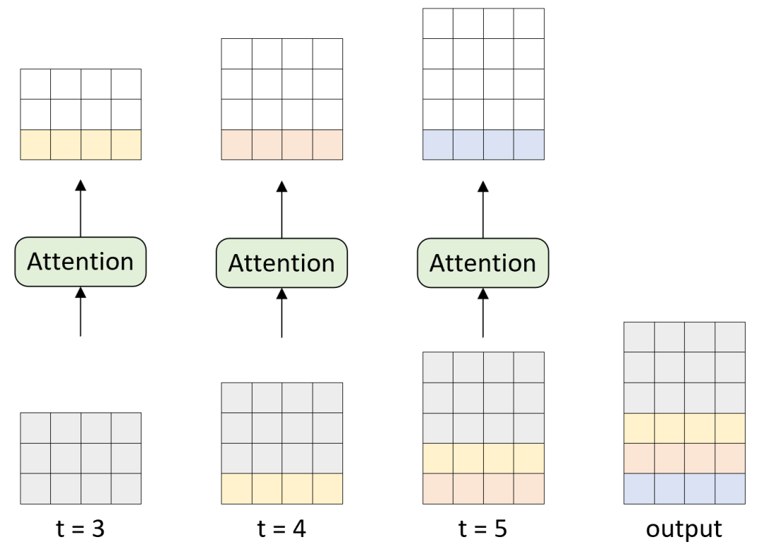 ② 因为只取每个时刻输出结果的最后一个时刻作为当前时刻的生成结果,所以在①的基础上,当前时刻的输入仅使用上一时刻的输出的最后一个时刻即可,不需要和先前的输入拼接,这就是解决前面提到的“冗余计算”的问题;