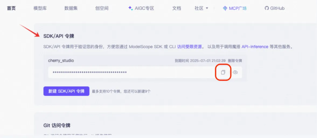 其中 API 令牌可以通过访问“魔搭首页-访问令牌”页面获取。