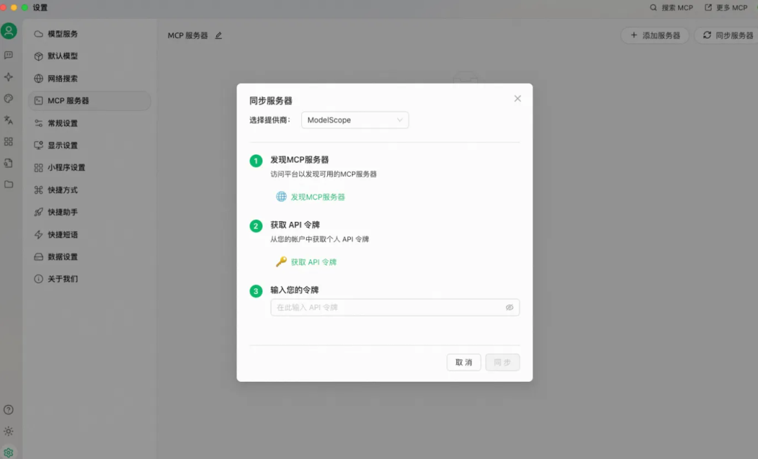 在Cherry Studio启用MCP服务需要在「设置」中添加可用的MCP服务配置。可以前往“设置-MCP服务器-同步服务器”快速同步ModelScope MCP服务。
