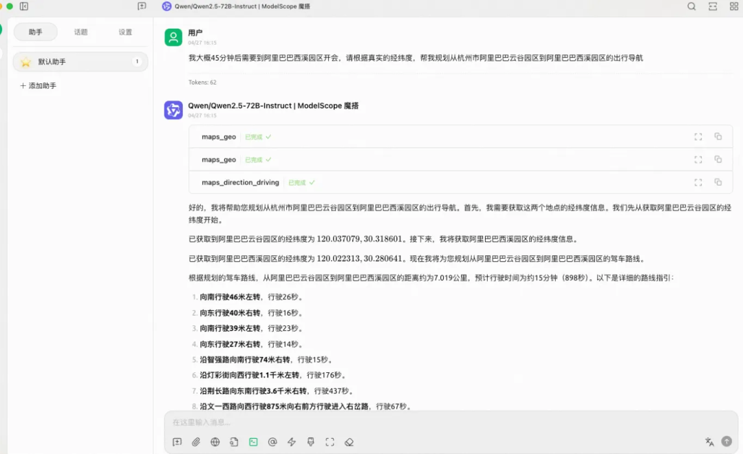 同样的,如果其他MCP已经被启用,也可以被AI助手自由调用。例如以下例子,就展示了使用高德地图MCP 来完成完成路线规划。