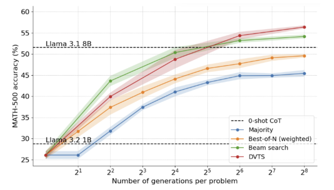实验证明:Hugging Face的一篇博客文章中的实验显示,使用 Beam Search 这种方法,一个1B参数的模型在数学问题上的表现,甚至可以超越一个8B参数的模型。这证明了好的推理流程可以极大地弥补模型规模的不足。其他更复杂的搜索算法,如A*、MCTS等,也都可以应用在此框架下。