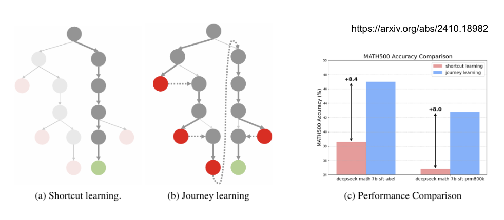 包含错误路径的训练数据: 一些研究如 String of Search 和 Journey Learning 提出,在构建训练数据时,应故意包含一些错误的探索路径和回溯修正的过程。例如,训练数据可以长这样:“尝试方法A -> 发现错误 -> 回溯 -> 尝试方法B -> 得到正确答案”。这样训练出的模型,才能学会“逆转胜”。