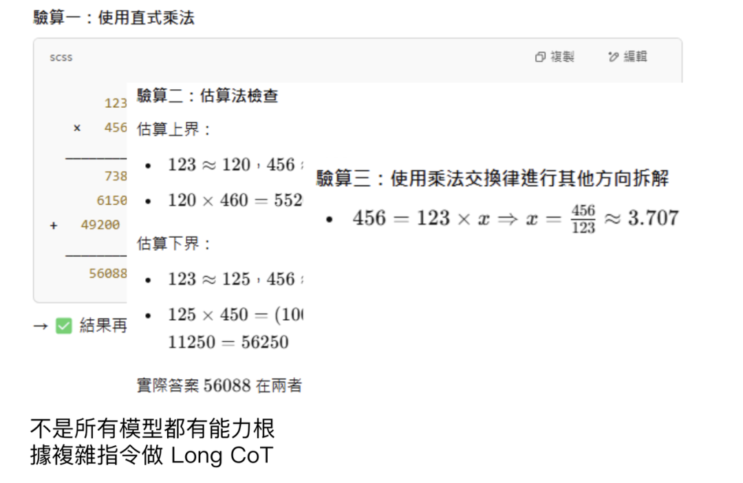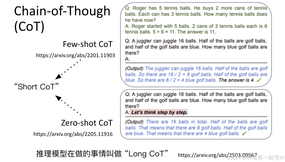 现在的推理模型所做的,可以看作是长思维链(Long CoT)。要让模型产生更长的思考过程,只需在Prompt中给出更详细、更精确的指示,这种方法也称为Supervised CoT。