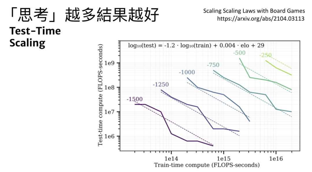 这个概念进一步引申出Test Time Scaling:思考越多,结果往往越好。一篇早期的论文研究了棋类游戏,发现可以将算力投注在训练时(得到更好的Policy/Value Network),也可以投注在测试时(做更大规模的MCTS)。实验结果表明,投入少量算力在 Testing Time,就可以显著减少在 Training Time所需耗费的大量算力。