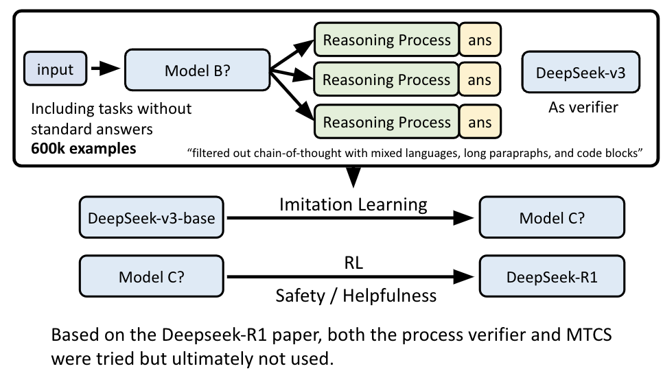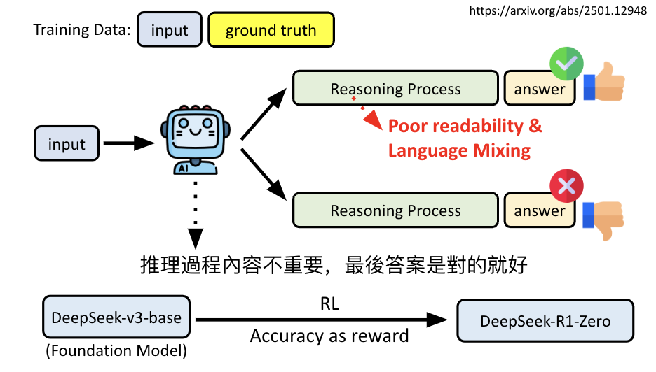 - 步骤一 (模仿学习): 用R1-0生成推理数据,然后投入大量人力去修改和润色这些数据,使其变得清晰可读。同时,也用Supervised CoT等方法生成高质量数据。用这些数据通过模仿学习训练出模型A。