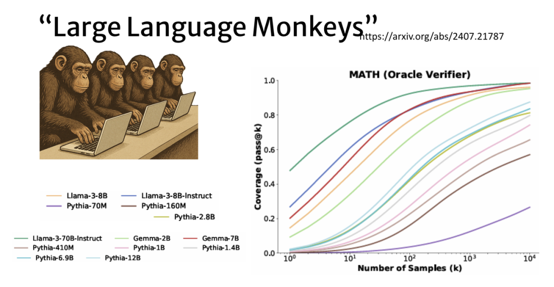 就像“无限猴子定理”,让语言模型对同一个问题回答成千上万次,由于每次回答都有随机性,它总有机会产生出正确答案。