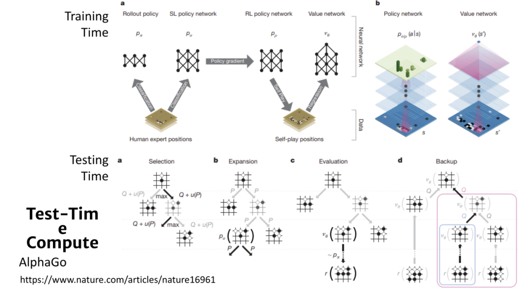 Testing Time Compute 并非全新概念。在AlphaGo中,除了训练时得到的 Policy Network 和 Value Network,在测试(实际下棋)时,它也进行了巨大的运算,即蒙特卡洛树搜索(Monte Carlo Tree Search, MCTS)。AlphaGo 会在“脑内”模拟多种下棋的可能性,预估不同位置的胜率,最后选择胜率最高的位置。