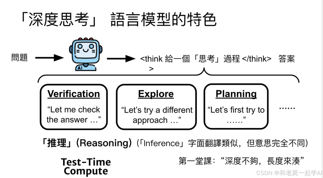 本课程中,我们把这种深度思考行为直接称为“推理(Reasoning)”,但这并不意味着其过程与人类的推理完全一样。