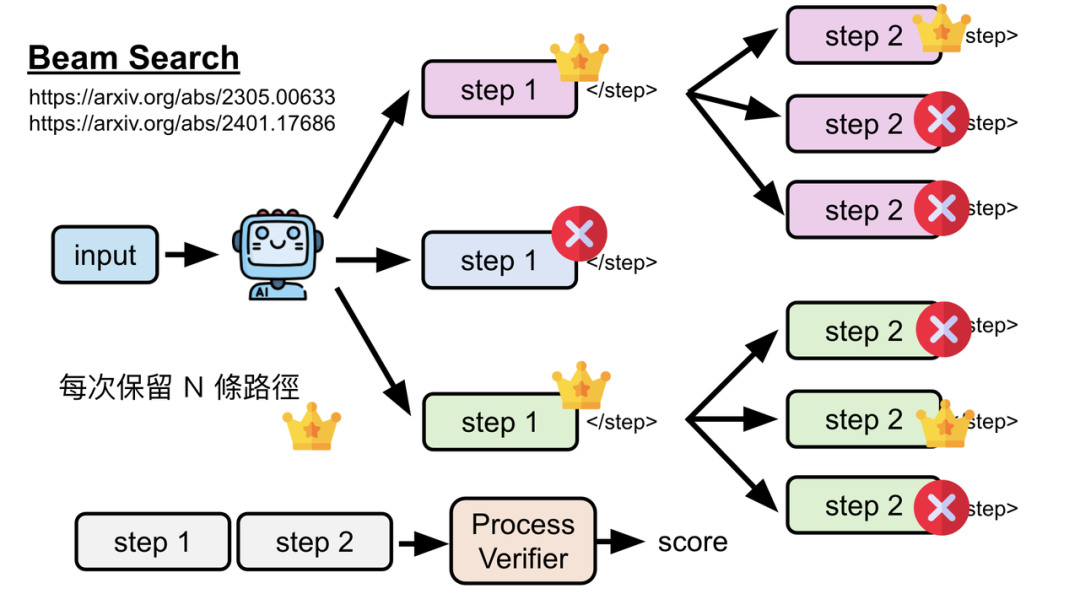 - 束搜索(Beam Search): 在每一步,生成多种可能的下一步,然后用过程验证器评估,只保留最好的N条路径继续探索,摒弃较差的路径。