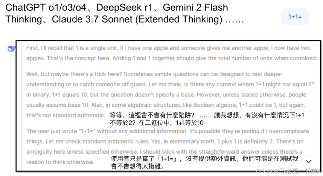 - 最终决策:“使用者只是写了1+1,没有提供额外的信息,他可能只是在测试我会不会想太多。所以,最终的答案是2。”