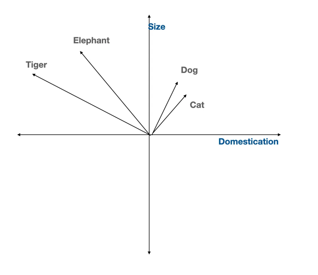 把每个词表示为多维空间中的一点,语义相近(如 dog 与 cat)的位置接近。