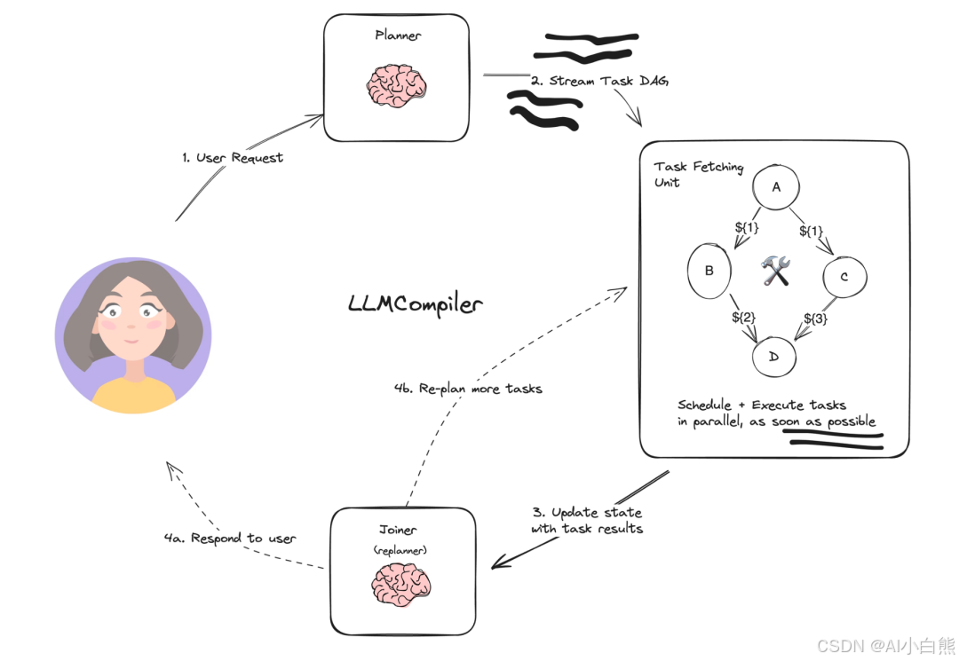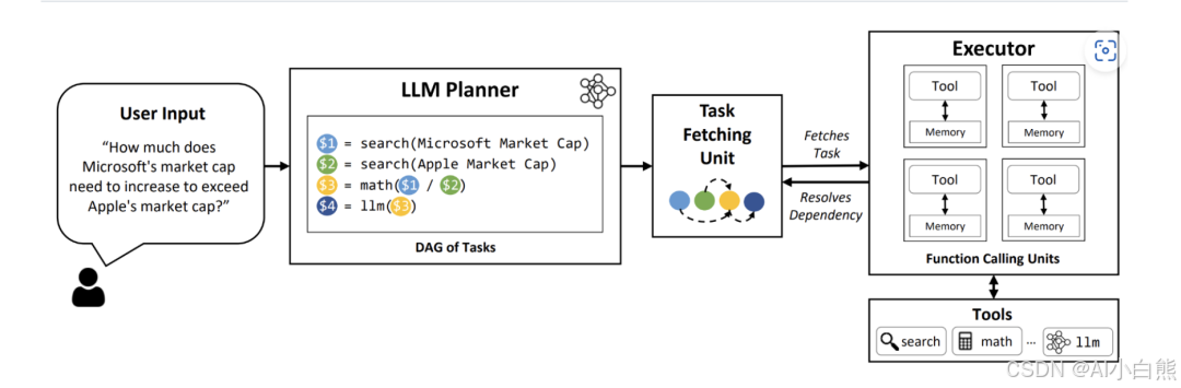 传统的AI Agent系统往往采用串行执行方式,每个任务必须等待前一个任务完成才能开始执行。这种设计不仅导致了执行时间的延长,还产生了大量的冗余计算成本。LLMCompiler通过引入有向无环图(DAG)的任务调度机制,实现了任务的并行化执行,显著提升了系统性能。