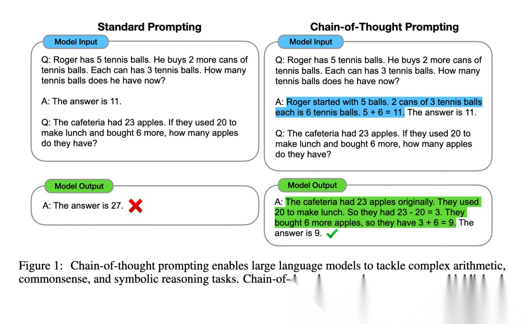 思维链的原理是通过提示词让模型在推理的时候不要直接给出答案,而是让其模拟人类进行推理,这样可以让结果的准确性大大提升。也就是模型在产生最终结果之前会有中间推理结果产生,我们可以看到论文里的这个例子