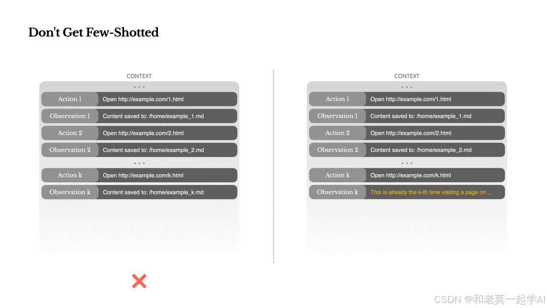 不过值得一体的是,在AI Agent的应用场景下,Few Shot不一定完全适用,有可能还会倒忙,我们可参考Manus的这篇文章[2]里提到的: