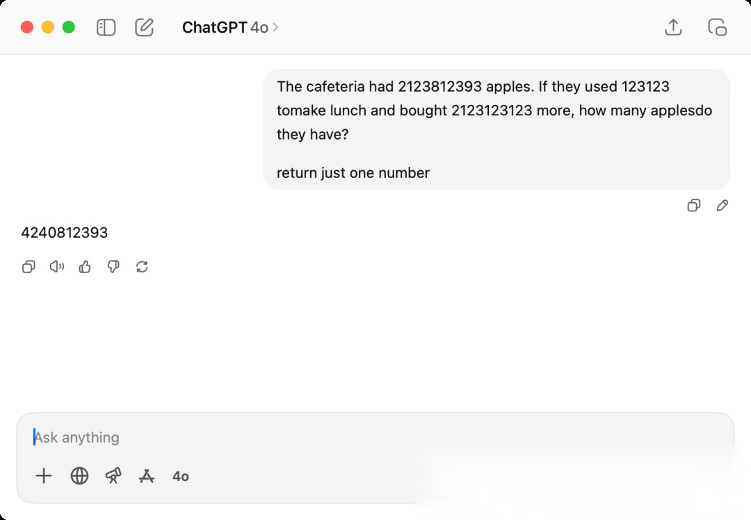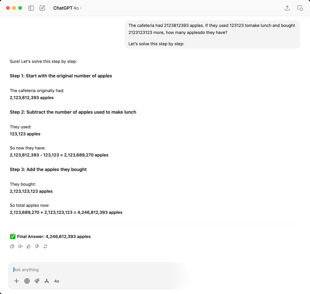 可以看到,当我们把论文里的问题里的数字提高到一个大数,模型就很难在不推理的情况下一下给出正确答案,第一次我使用return just one number就是防止模型自我进行推理,因为现在模型相对聪明一点,哪怕不是推理模型也会简单的推理演化再给出结果。这边得到的答案是4240812393,实际的答案是2123812393-123123+2123123123=4246812393