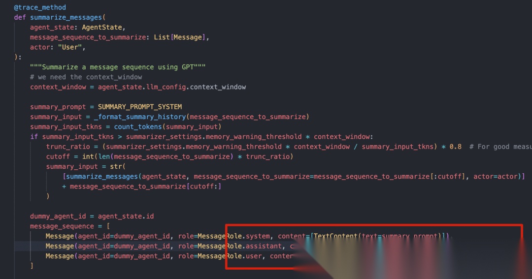 在Letta的代码里我们可以看到,Letta也是借助了大模型,利用特定的系统提示词来对聊天历史记录进行摘要的动作,我们可以看到: